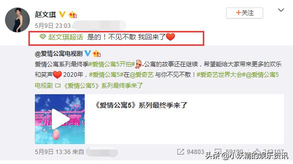 还有让爱情公寓男士们,一度惊艳的秦羽墨,也不知会不会回归到《爱5》,在4月份时,编剧汪远和赵文琪互动也非常耐人寻味:再遇文琪,这么多年一点没变!在5月9日时,赵文琪也发了微博:是的,不见不散,我回来了!这也预示着在《爱5》中秦羽墨回归了!
