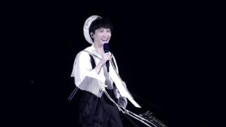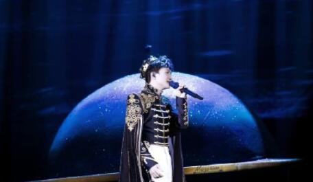 周深的舞台造型就比较夸张了,丝绒质地的大衣搭配上黑白色的衬衫,束腰的设计很好的分割了比例,看起来十分流光溢彩。