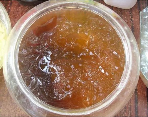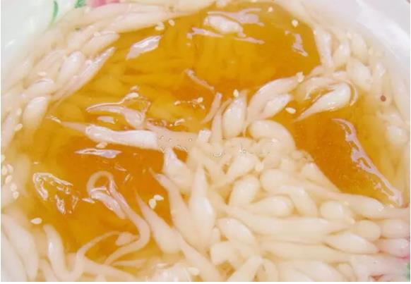 赤花籽,方言称其为“瓷娃子”,是宜昌所特有的消暑小吃。透明胶状饮品,口感细嫩幼爽,多为路边小贩经营,也可家庭自制。