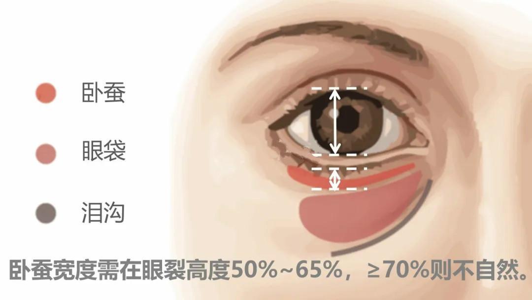 什么样的卧蚕才是完美漂亮的呢?首先,你的眼裂宽度决定了卧蚕的宽度。一般情况下,卧蚕的宽度应该在眼裂宽度的50%-65%之间,超过70%就不自然了,看起来就和眼袋相差无几。