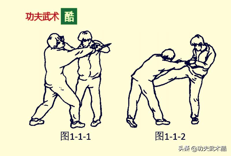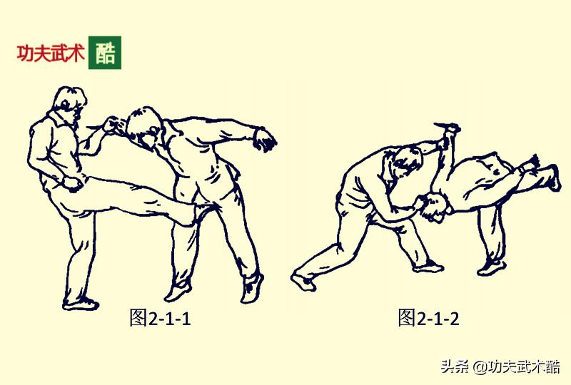 敌方上右步,右手持刀由外向内摆动划刺我方颈部;我方立即以左手向外挡抓敌方右小臂,同时以右弹腿猛踢敌方的裆部(图2-1-1)。趁敌方裆部被踢而向前弯腰低头之际,我方迅速以右手抓住敌方的头发往回拉拽的同时并下按敌方的头部,将敌扑面摔倒(图2-1-2)。