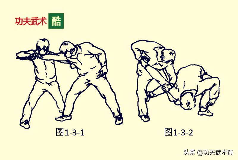 敌方上右步,右手反握匕首向我方胸部直刺;我方立即上左步侧移右侧闪身的同时用右手刁抓敌方右小臂或右衣袖并回拉,同时用左横拳猛击敌方的右肋部位(图1-3-1)。紧接着,我方屈左肘由外侧砸敌上臂以卸其右肩,迫使敌方伏地就擒(图1-3-2)。