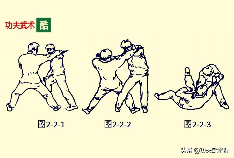 敌方侧对我方,双腿成马步,右手持刀向我方摆动划刺我方颈部;我方迅速向左滑步闪躲,同时用左手向外挡抓敌方的右手腕并回拉(图2-2-1)。紧接着,我方我方迅速上右腿至敌方后侧以绊住敌方右腿,同时用右掌猛力砍击敌方的颈部左侧,迫使敌方上身后仰(图2-2-2)。上动不停,我方右腿随即快速向后勾挑敌方的右腿,同时右掌向前向下推按敌方颈部,将敌方别摔在地(图2-2-3)。