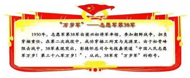 抗美援朝时期:第二次战役中,38军担负关键的穿插重任,共歼敌1.1万余人,缴获坦克14辆,大炮 200余门,汽车300余辆,一举扭转了整个朝鲜战局。志愿军司令员彭德怀在嘉奖电的最后亲笔写下“第38军万岁!”
