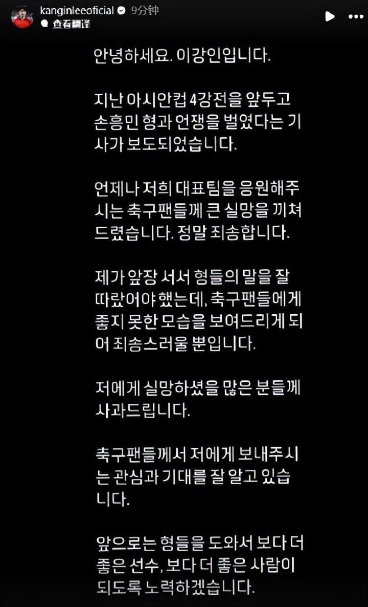 李刚仁:“大家好,我是李刚仁,有一篇文章报道说我在上届亚洲杯半决赛前与孙兴慜发生了争执,让一直支持我们国家队的球迷们感到非常失望了。我真的很抱歉。我应该听从哥哥们的话,很抱歉给球迷们留下了不好的形象,我向很多对我失望的人道歉。”