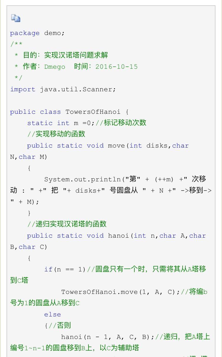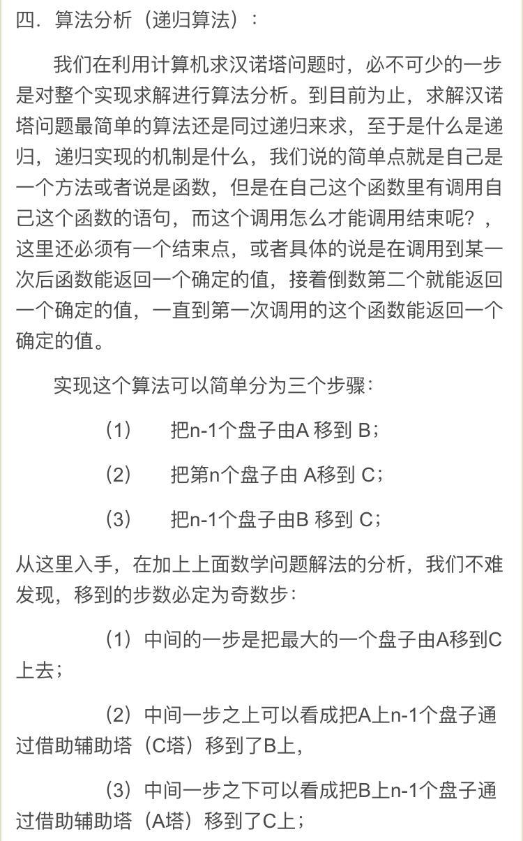 知道这个故事是在大学的计算机课上,老师给我们讲一种算法“递归”:自己调用自己,让我们用“递归”来求出需要多少步,当时很难理解。假如当时就能见到汉诺塔,在形象思维和抽象思维并用的情况下,对“递归”这个枯燥的概念就有了全新的理解和认识。