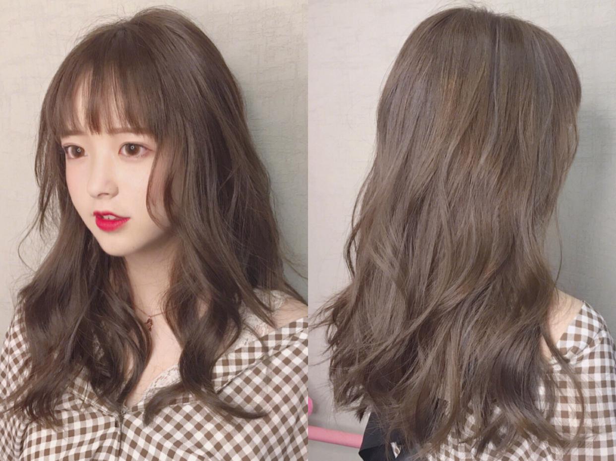 奶茶色搭配长卷发也是很美的,这是一种比较适合亚洲人肤色的发色,有点偏棕色,阳光下会显得比较有光泽,带给人很温暖感,还能让你轻松显肤色白,搭上卷发让你秒变小仙女,还可以保留空气感的刘海,十分的少女感,还特别的显脸小。