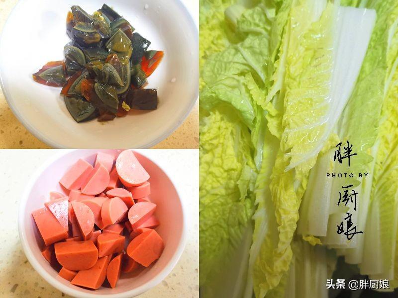 ①先做下准备工作。娃娃菜洗干净,我这边菜市场是一包3颗,我都用了,因为比较爱吃。洗净之后把一颗娃娃菜切成四瓣。大葱和姜切成末;皮蛋和火腿肠切成小块。