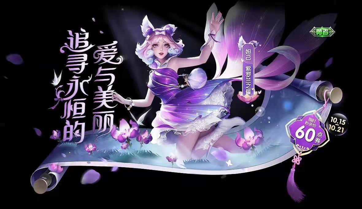 王者官宣,妲己的新秒杀皮肤【紫罗兰之誓】将在今天10月15日0点限时上架,10.15-10.21首周折扣60点券即秒杀价6元。