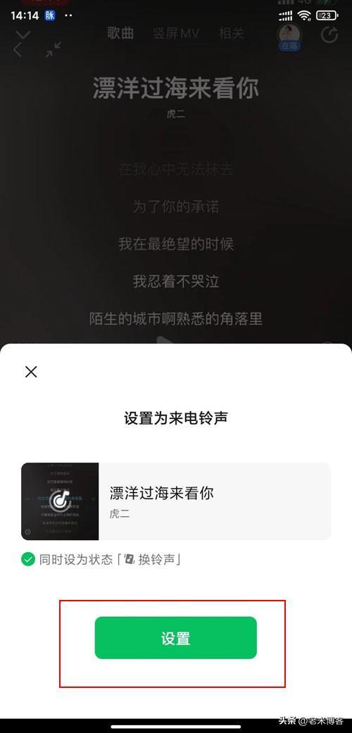 第七步:打钩是否同时设为状态【换铃声】,点击【设置】,即可设置成功;