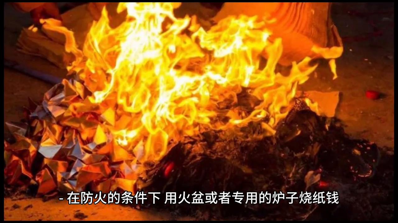 ·5.焚烧纸钱:在防火的条件下用火盆或者专用的炉子烧纸钱,将纸钱折叠好或是撕成小片,有的地方习惯上需要逆时针方向撕破,在烧制的过程中注意安全,防止火星四溅引发火灾。