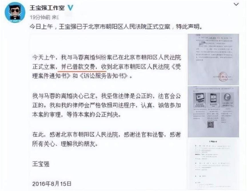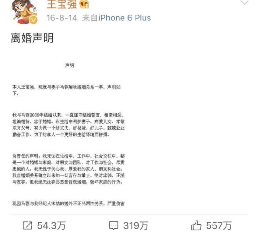 2016年8月14日凌晨,王宝强在毫无预兆的情况下,在自己的个人账号上发布已经离婚的声明。