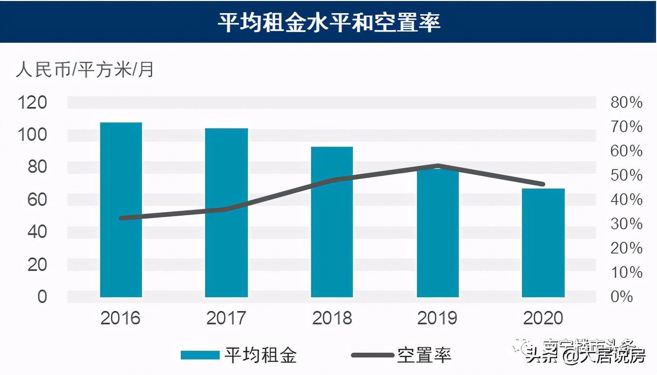 根据戴德梁行数据统计,2020年末,南宁甲写的空置率46.7%,写字楼市场去化压力不小。