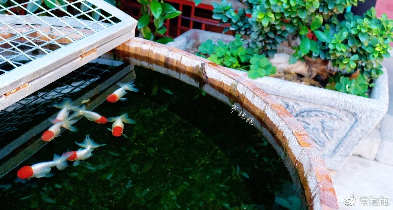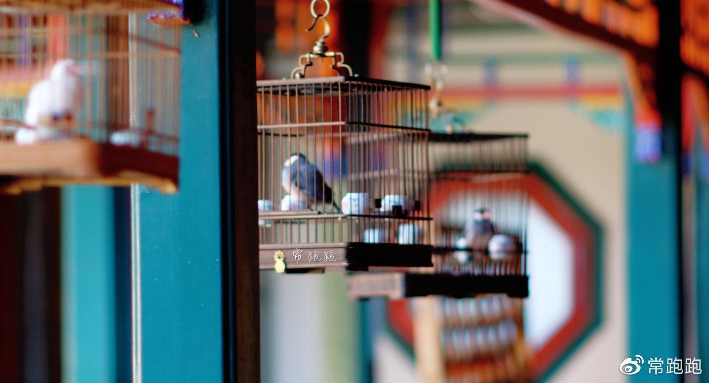 北京湖广会馆的后院也是十分有意思的地方。后院长廊上挂着鸟笼、空地上架起大木海,里面养着“绣球”、“龙井”、“红帽子”等品种的金鱼。
