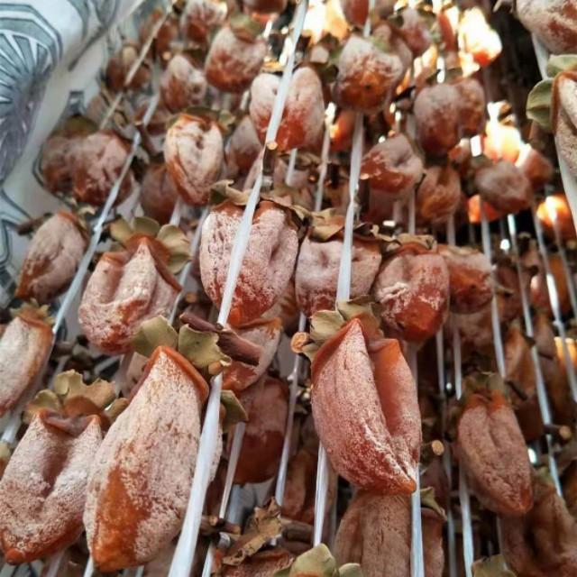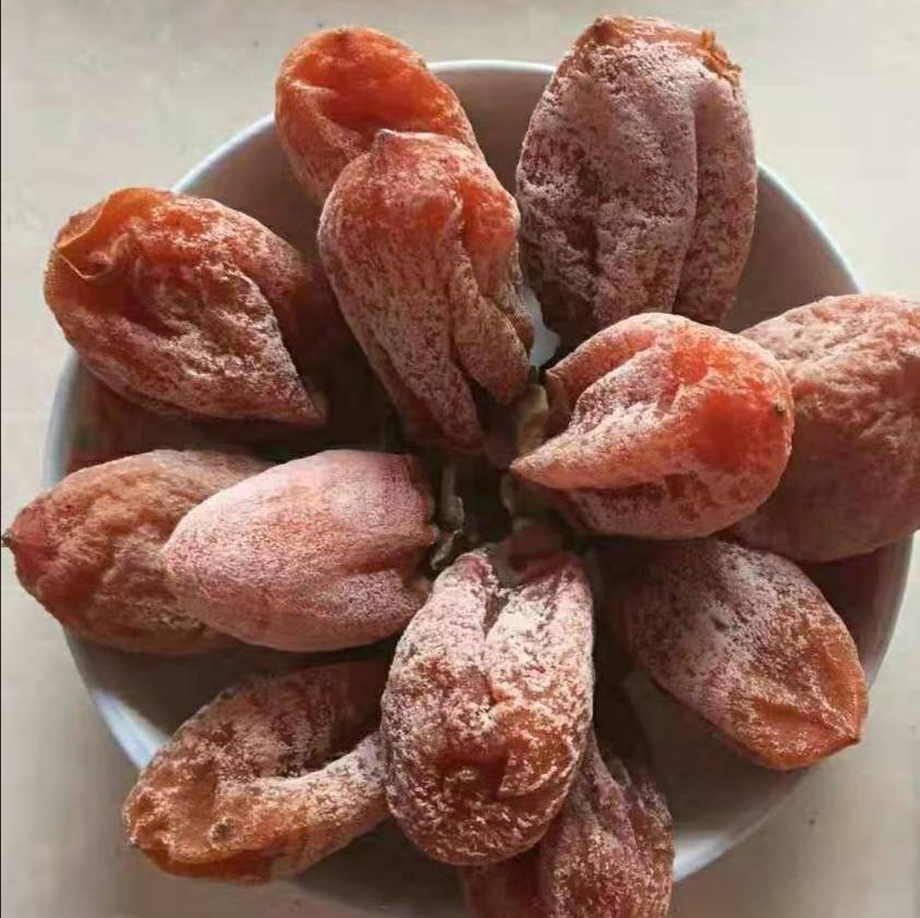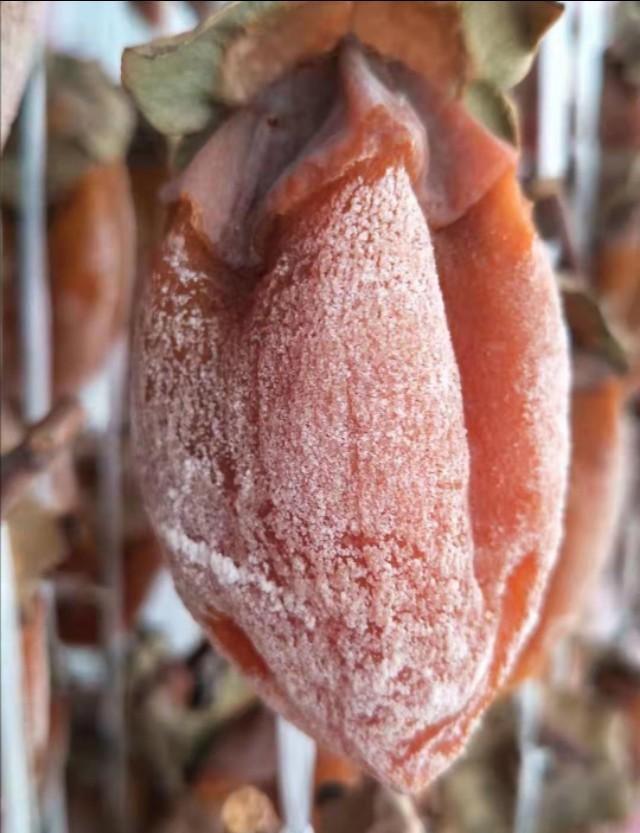 小知识:柿饼表面的白霜,是柿子本身的天然糖分在晾晒过程中,随着日晒和温度的变化,糖分慢慢析出渗透到表层,形成了白色结晶,这一层白色结晶叫做“柿霜”,具有润肺止咳、生津利咽等功效。柿霜不是柿饼坏了,而是富平柿饼著名特色!