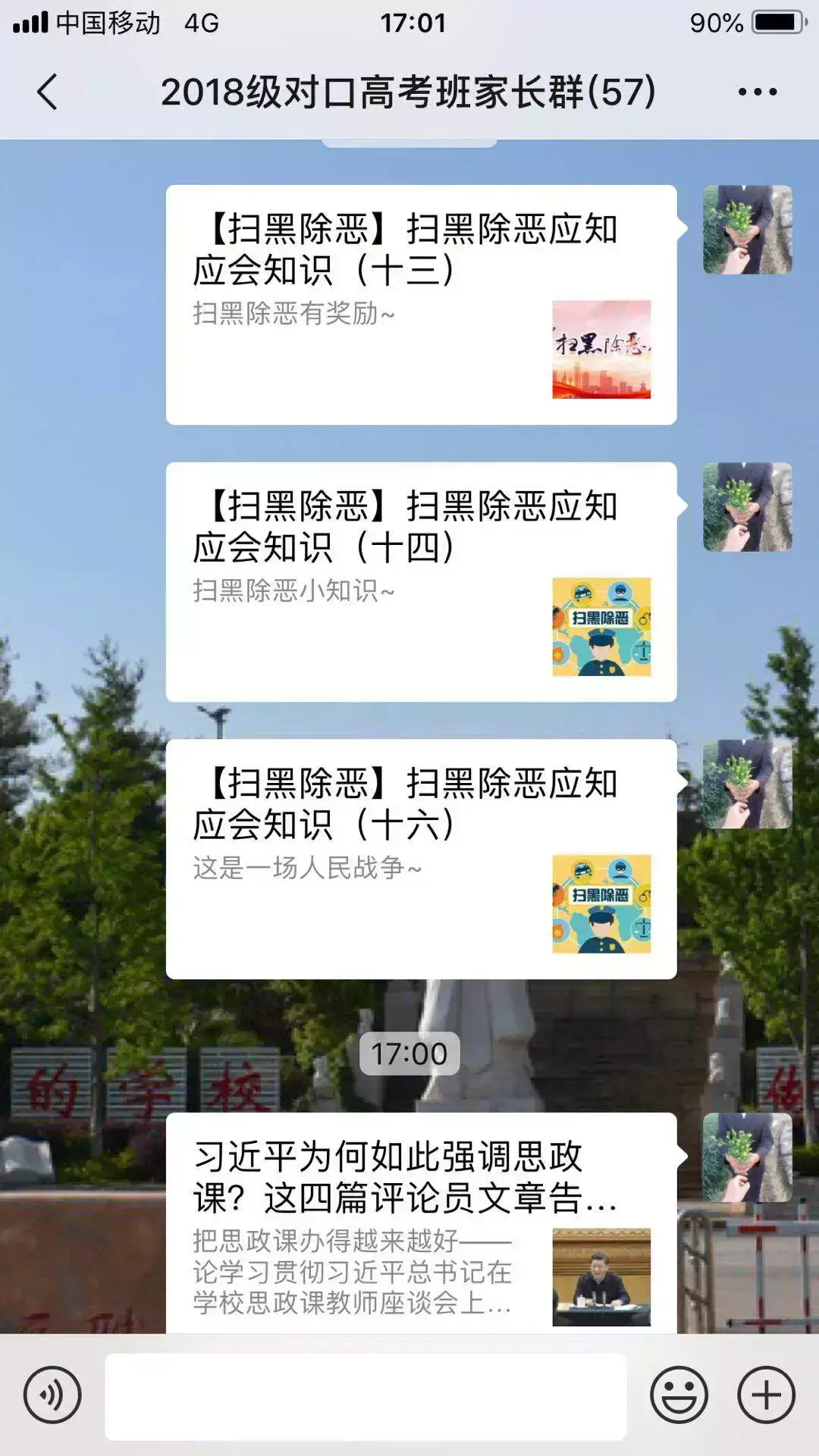 此外,学校还通过校讯通、家长群等媒介,向家长发送“扫黑除恶”相关信息,引导家长配合学校做好学生的教育工作;利用国旗下的讲话、教职工大会、黑板报、宣传栏、电子屏等多种方式,扩大扫黑除恶专项斗争的影响力,营造良好氛围,构建平安和谐校园,为学生健康成长保驾护航。