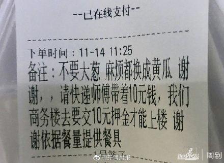 【外卖员送餐上楼得交10元“押金” 这钱收得合法吗?】外卖员去写字楼送餐,还得先交10元押金?近日,上海盛邦国际大厦开始实施这条规定。记者在送餐高峰期采访时,桌上登记册显示,一个小时内押金“流水”已有近500元。大厦物业表示,设置这条规定是对大楼的安全负责,也是为了让外卖员严格遵守货梯进出的规定。但是有外卖员因没带现金无法上楼,导致员工只能自己下楼取餐。不少人质疑:“我就是图个方便不想下楼才点的外卖,如果要我自己下楼取,那点外卖还有什么意义?”
