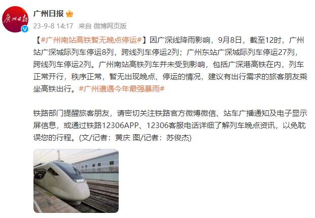 因广深线降雨影响,9月8日,截至12时,广州站广深城际列车停运8列,跨线列车停运2列;广州东站广深城际列车停运27列,跨线列车停运2列。广州南站高铁列车并未受到影响,包括广深港高铁在内,列车正常开行,秩序正常,暂无出现晚点、停运的,建议有出行需求的旅客朋友乘坐高铁出行。