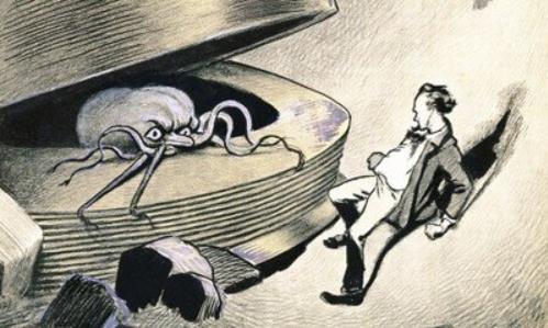 所以,H·G·威尔斯笔下的火星人,是一种类似于章鱼怪的动物,他们皮肤灰色,似乎还覆盖着黏液,通过触手操控巨大的机器——很明显,威尔斯此时参考的是海洋软体生物。