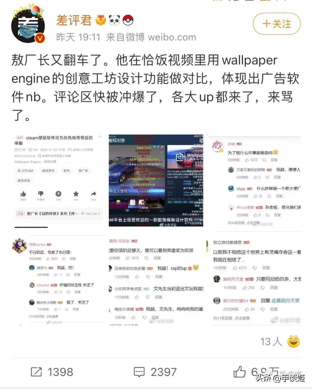 仅对于这件事而言,姬大概看到有两种说法,一是觉得既然是灰色地带,就不应该讲wallpaper engine,讲了的话这款软件或许就会被殃及,甚至会殃及到Steam平台,二是觉得敖厂长这这则视频做得糊弄,作为一个游戏玩家,把wallpaper engine和一款叫“懒设计”的应用作比较真是岂有此理。