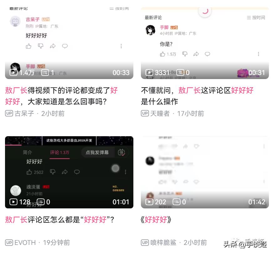 刷了一会敖厂长视频的评论,手谈姬就接着去写游戏推荐了,写完后大概七点多,又看了一眼敖厂长那边,热评几乎是以好评为主,于是不自觉地点开了“按时间”排序,却看到清一色的“好好好”,有种机器人般的协调感,看来是控评了。