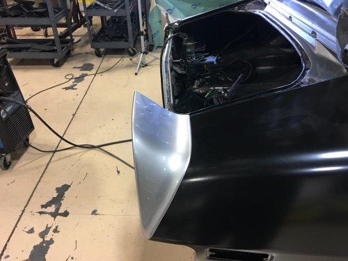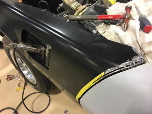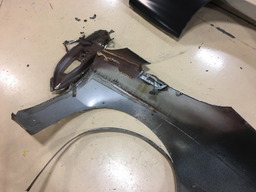 在喷涂底漆之前,需要对覆盖件之间的缝隙进行调整。原来的前翼子板最终还是因为无法适配而进行了更换,而新的前翼子板与车门之间也有较大缝隙,因此对新的翼子板进行了切割补焊。