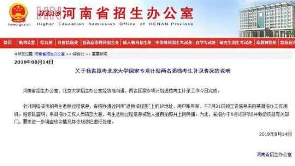 8月11日北京大学发布通报称,8月6日以来,北京大学在河南省招录“国家专项计划”的工作受到社会舆论关注。学校对此非常重视,第一时间成立专项工作组,全面了解核实河南省“国家专项计划”招生录取的具体情况。经核实:北京大学2019年在河南省“国家专项计划”理工类招生计划8人。2019年7月10日,在河南省“国家专项计划”投档前,河南省招生办公室与北京大学招生办公室就生源分布情况进行沟通,说明第一志愿报考考生有8人,其中,第6名考生考分为667分,第7名考生考分为542分,第8名考生考分为536分,第二志愿报考考生中有高分考生。河南省招生办公室向北京大学投出“国家专项计划”理工类第一志愿8人档案,双方招生办公室经过充分沟通,在录取系统中进行正常交互手续后对第7名、第8名考生予以退档;完成退档手续后,河南省招生办公室向北京大学投出“国家专项计划”理工类第二志愿2人(考分均为671分)档案,北京大学招生办公室予以录取,由此完成2019年在河南省的“国家专项计划”招生工作。对此,北京大学招生委员会召开专题会议,听取招生办公室工作情况汇报。会议审议认为:2019年我校在河南省“国家专项计划”招生任务已经完成;鉴于河南省“国家专项计划”录取工作采取按顺序志愿投档的方式,已退档的2位考生达到了同批录取控制分数线且符合录取条件,应予录取;退档处理过程存在不合规之处,招生办公室的退档理由不成立。招生委员会决定按程序申请补录已退档的2位考生。