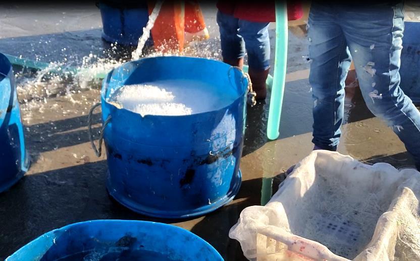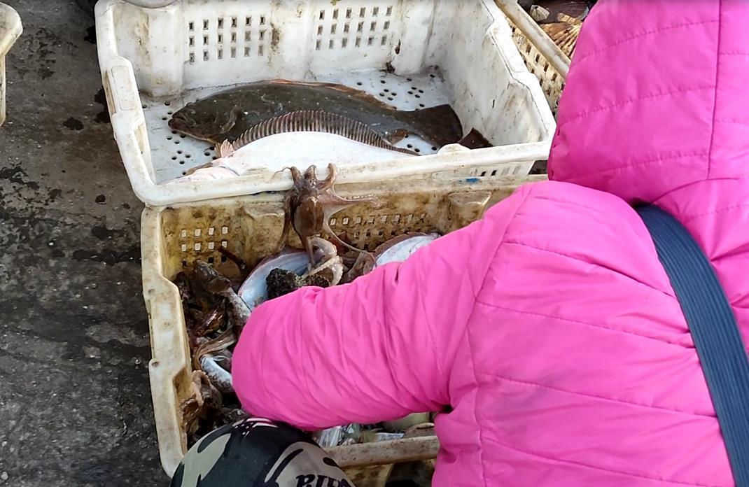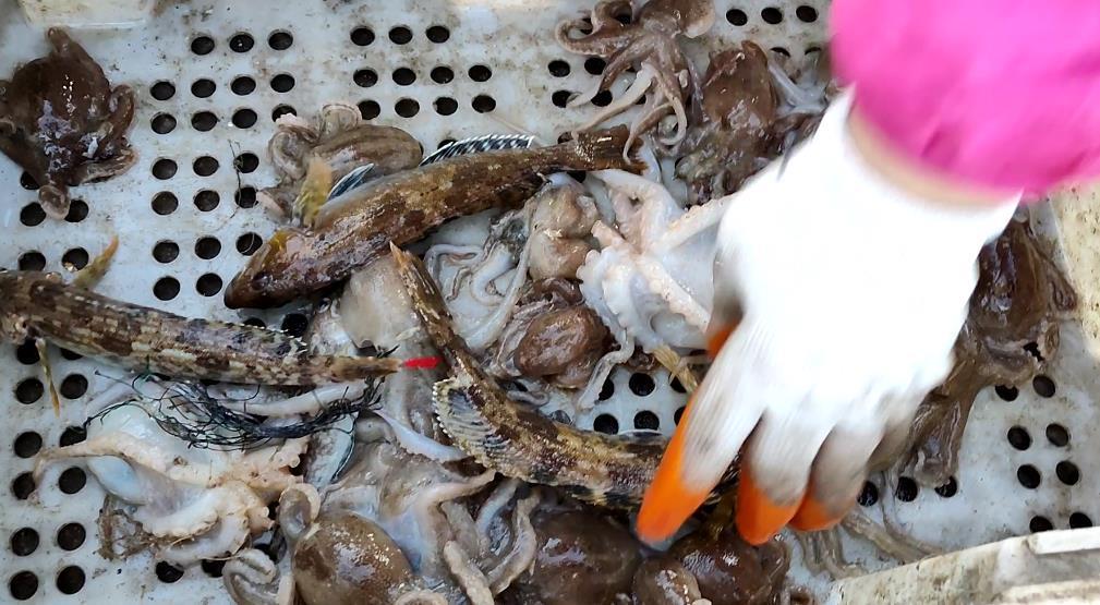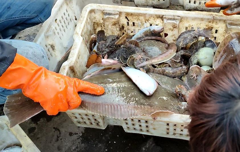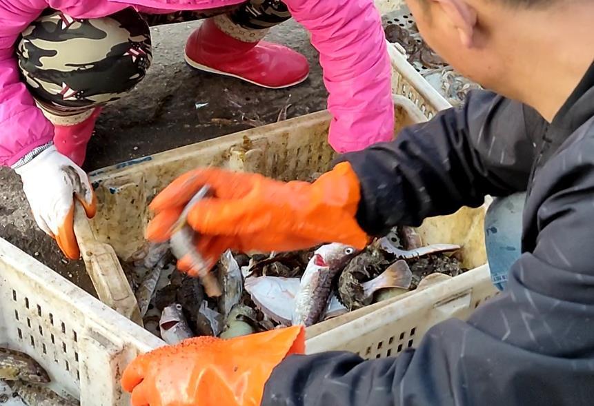 随着一阵躁动,终于有像样得渔获上岸了。这是一条拖网船。捕到了各种各样得海鲜。船老板一边捡鱼一边说,鱼太少了。再这样下去我都要饿死了。