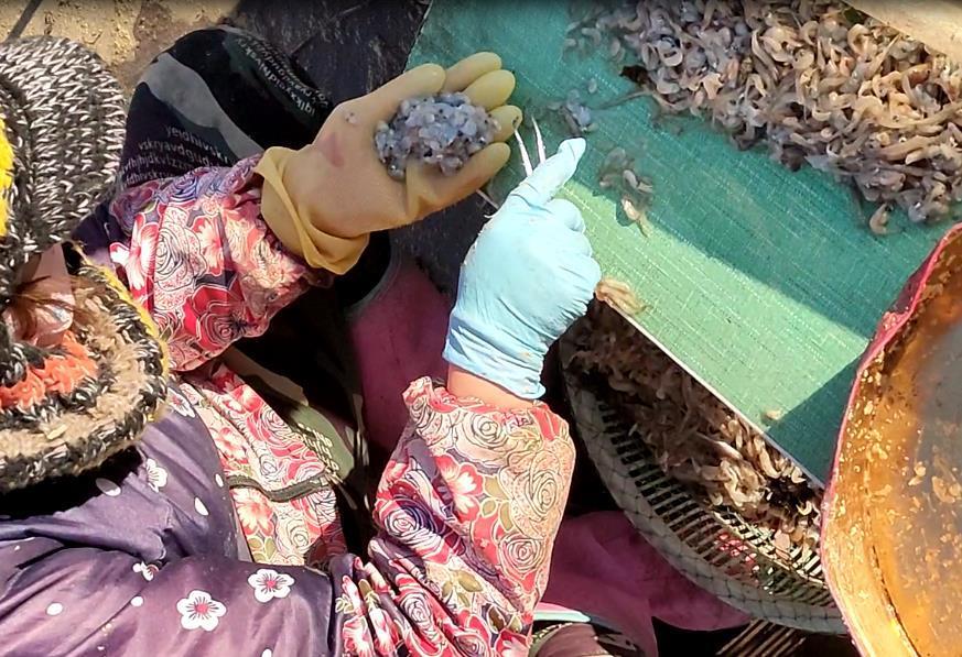 大姐一边捡一边感叹,一个小时才捡2斤,全是功夫钱啊。经过观察,这个乌鱼豆是从虾酱里筛选出来得。可能以前也没注意就和在小鱼小虾里一起卖了。现在海鲜值钱了,所以给单独捡出来能卖点高价钱。