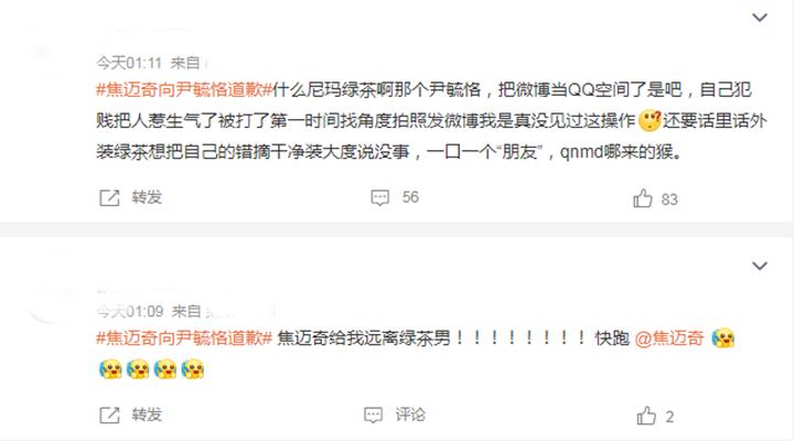 焦迈奇动手揍尹毓恪的事情,很快在网上引发热议,一个名为焦迈奇向#尹毓恪致歉#的话题,更是冲上热搜榜,仅两个小时的时间,就吸引近百万网友的围观。大部分网友都对焦迈奇动手打人的行为表示谴责,但同时也表示两人存在炒作的嫌疑,认为这种鸡毛蒜皮的小事,根本没必要拿到台面上说事,甚至还有网友嘲讽尹毓恪脸上的痕迹,是美妆博主精心打扮的妆容;也有少许网友谴责尹毓恪的绿茶行为,明明是自己不对在先,却伪装成了最无辜的样子。