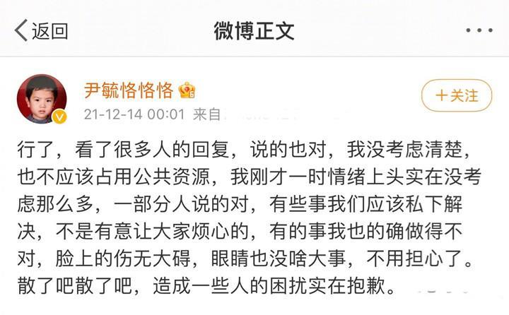 对于网友的质疑,尹毓恪于14日凌晨再次发文表示:“大家说得对,我不应该占用公共资源,这件事情应该私下解决,脸上的伤并无大碍,眼睛也没啥大事,大家都散了吧。”