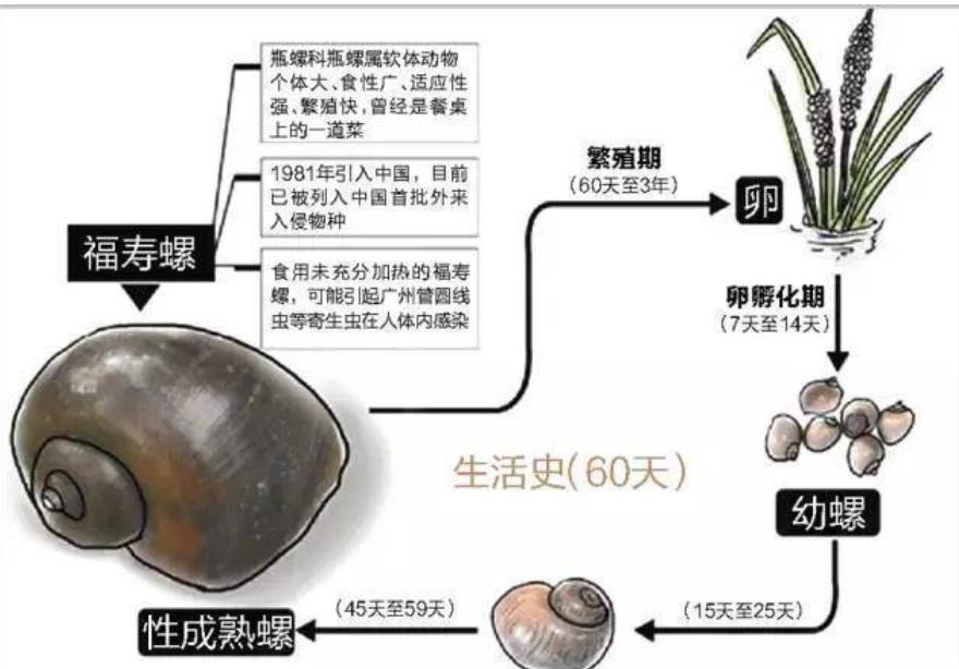 在寄生性病原携带方面,福寿螺携带了比如广州管圆线虫等人畜寄生性病原,在没有进行合理的处理,很容易感染人类。