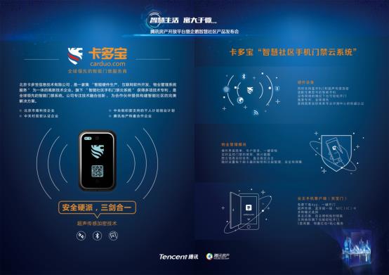 在发布会期间,卡多宝信息技术有限公司正式与腾讯公司达成战略合作,将共同为亿万用户提供一站式智慧社区服务。
