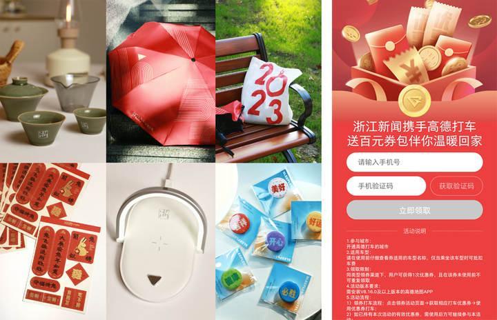 浙江新闻新系列周边包含文创茶具、多功能无线充电、定制帆布袋、晴雨伞、兔年梗春联、吉祥话手机支架等。