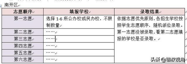 南开区小升初招生分两个阶段,第一个阶段最多只让学生填报1-6所学校,不限公办民办,录取方式同和平区一样,如果六个志愿都没被录取,则进入第二阶段,随机派位完成招生。未被第一阶段录取的学生,将重新填报志愿选择片内有学位的公办初中或区内有学位的民办初中。