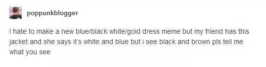 “我真不想再搞个白金蓝黑的事情出来,但是我朋友买了这个夹克,她说是白色+蓝色,而我看到的是黑色+棕色,请你告诉我,你看到了什么颜色?”
