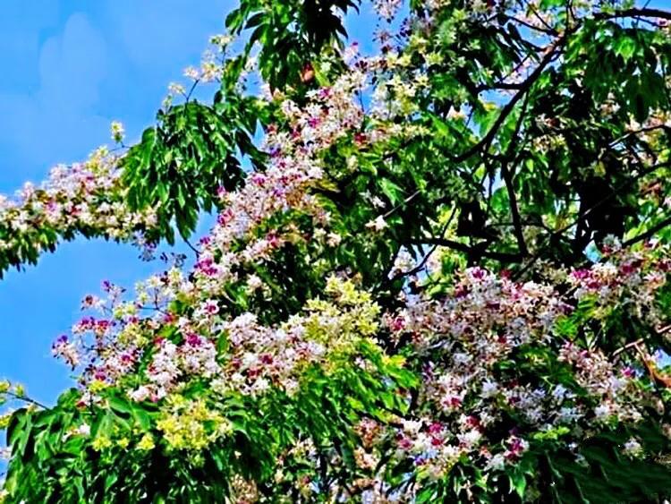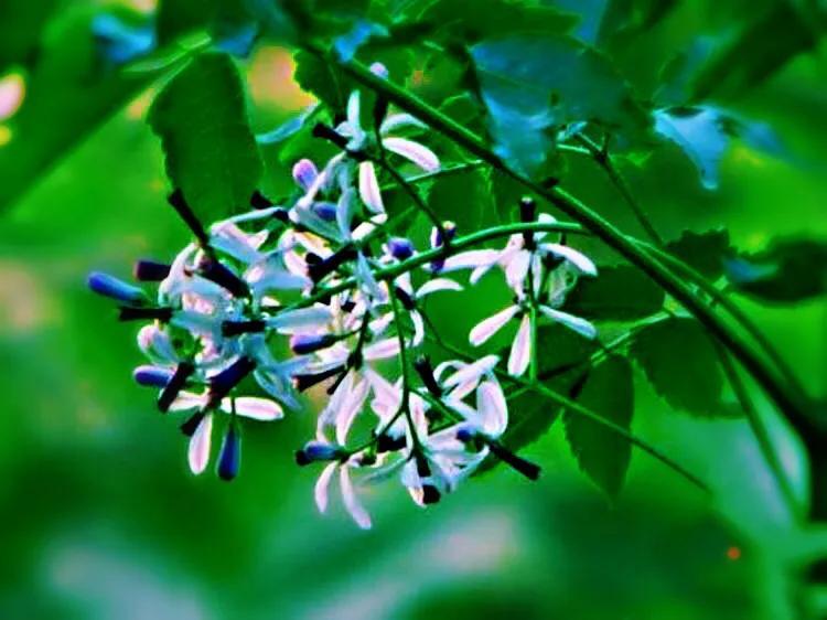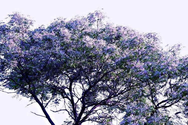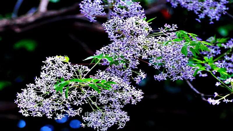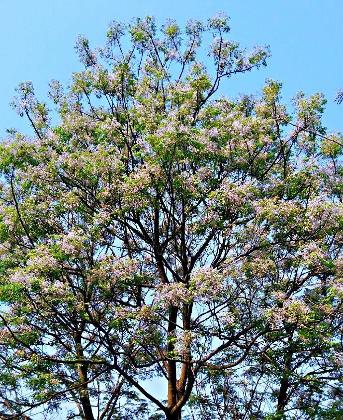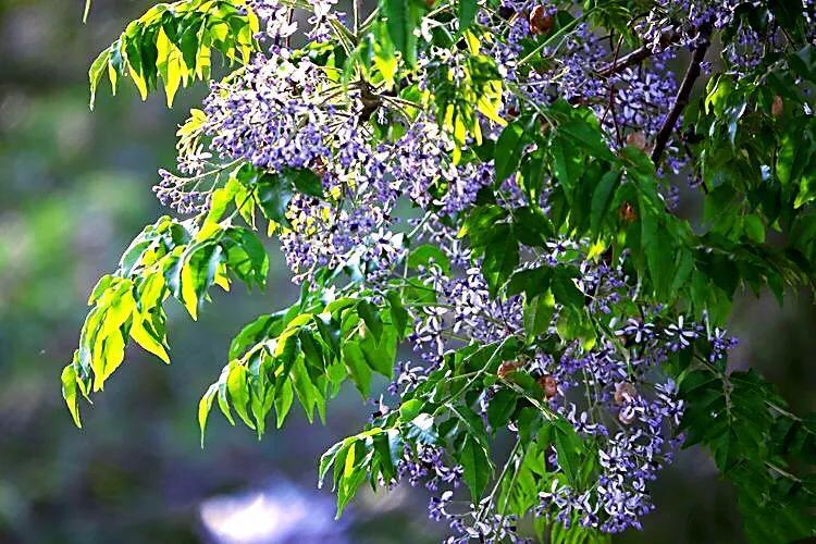 "苦楝发花如海棠,一蓓数朵,满树可观"。苦栋开花不是一朵两朵的开,是成千上万地开,淡紫色的小花簇簇团团,夹着初绿的楝树叶,叶中有花,花满枝叶,形成淡紫色为主体,紫绿交互的树冠,满树都是紫色的梦幻。