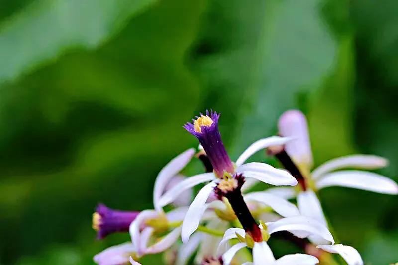 而每一朵小花极富特色,花萼5深裂,花瓣淡紫色,比较特别是苦楝花为单体雄蕊,花药完全分离,而花丝彼此连结成筒状,包围在雌蕊外面。花柱细长,不伸出雄蕊管。花的中心形成一个漂亮的紫色管状体。