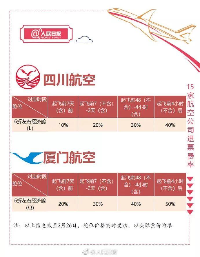 目前,多家航空公司已实行四档退改签“阶梯费率”,你的特价机票也可退了!以6折经济舱机票为例,不同航空公司如何收取手续费?怎样退票,手续费最低?15家航空公司退票费率表↓转发收藏!
