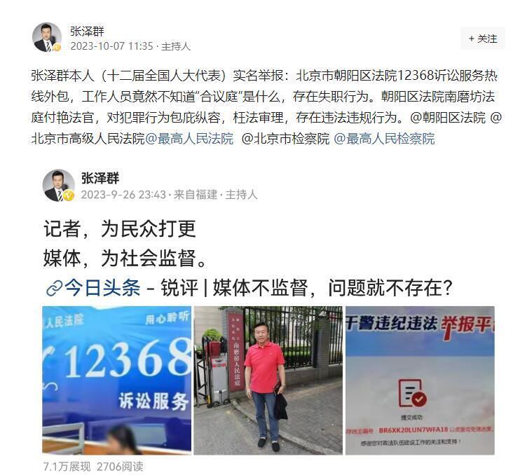 10月7日,央视著名主持人张泽群在社交平台连发六条动态,实名举报北京市朝阳区法院12368䜣讼服务热线存在外包行为;朝阳区法院南磨坊法庭付艳法官,对犯罪行为包庇纵容,枉法审理,存在违法违规行为。目前,朝阳区法院并未对该举报进行回复。
