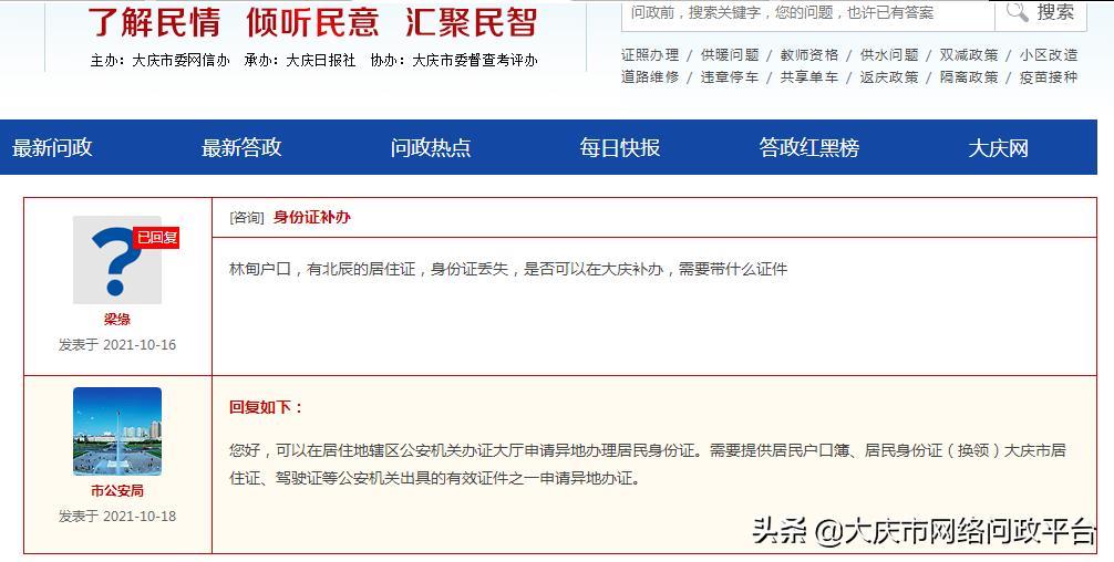 林甸户口,有北辰的居住证。身份证丢失,是否可以在大庆补办?需要带什么证件?