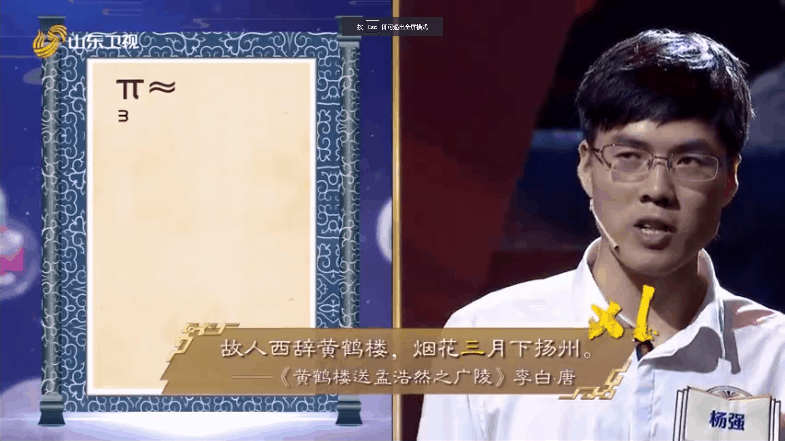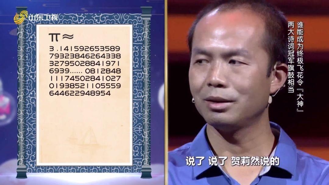 在这一场山东卫视的《国学小名士》飞花令中,则是由主持人报出“π”小数点后的数字,参赛者轮流飞出相应诗句,不能与之前重复。
