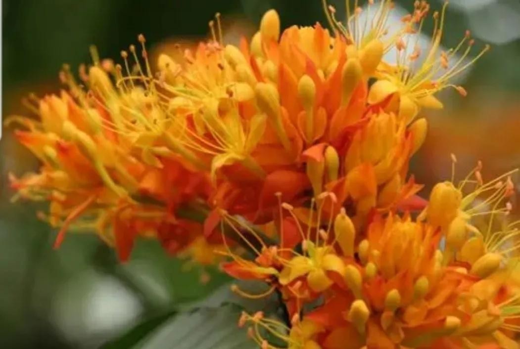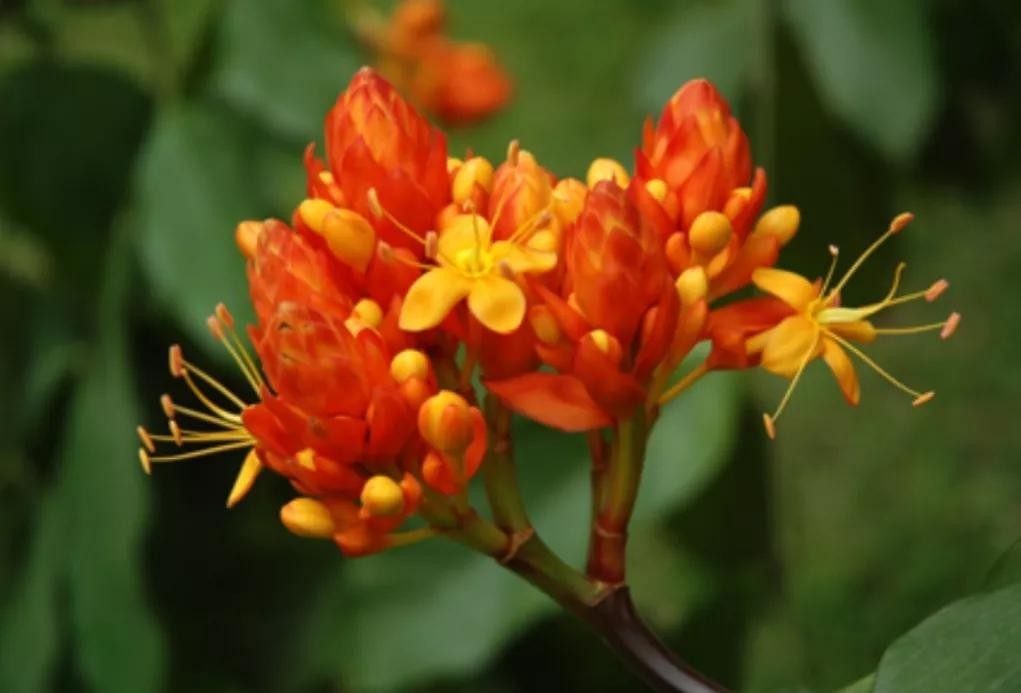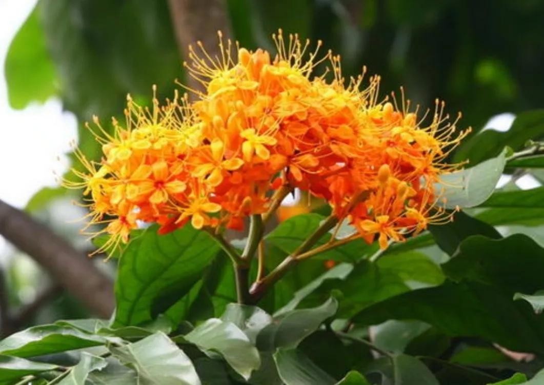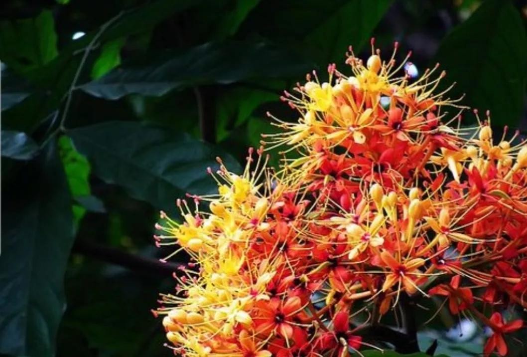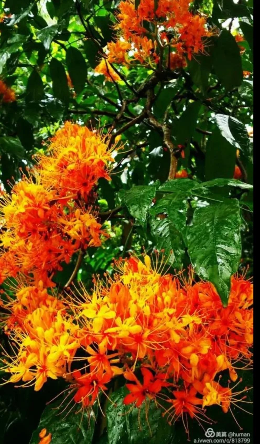 无忧树枝繁叶茂,嫩叶呈垂状,细看宛如一件被雨打湿了的紫色袈裟,花红似火焰,大而艳丽。