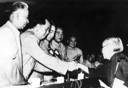 (何香凝女士经过主席台时,各位领导人站起来和她握手问候。)