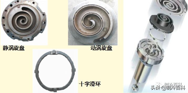 涡旋式压缩机主要由两个涡旋盘相错180度对置而成,其中一个是固定涡旋盘,而另一个侧是运动涡旋盘,它们在几点上接触并形成一系列月牙形容积。运动涡旋盘一方面为了与固定涡旋盘啮合而保持给定的旋转半径,另一方面做不自转的旋转运动,这是靠安装在动、静涡旋盘之间的十字滑环来保证。吸气口在涡旋盘的外表面,随着曲面的顺时针转动,气体由边缘吸入,进入月牙形容积,并在顺向中心运动的同时,使月牙形容积逐渐缩小而压缩气体.