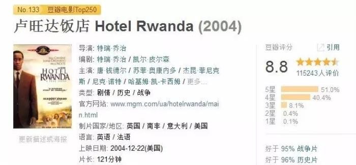 但对于整个事件的残酷性还是缺了点必要信息,一致消弱了整体的穿透力和表现力;同时在影片的态度上,虽然对西方国家形象做了一些批判,但总体上还是较为亲和的,为了呈现这种态度,而导致无法更多展示图西族和胡图族人本身的观点,这不得不说是一个遗憾。