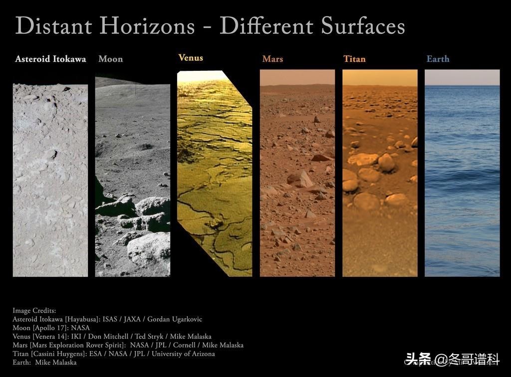 太阳系中六个不同星球的表面,从小行星到月球,再到金星、火星、泰坦和地球,展示了各种各样的属性和历史。