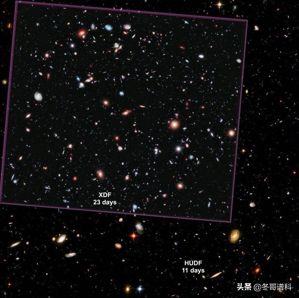 哈勃极深场(XDF)可能只观测到了天空区域的1/32,000,000,000,但却发现了其中多达5500个星系:估计占这张铅笔式切片中实际包含的星系总数的10%。
