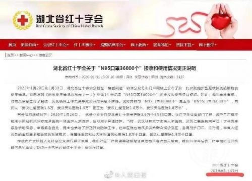 1月31日下午4时许,湖北省红十字会在其官方网站发布《湖北省红十字会关于“N95口罩36000个”接收和使用情况更正说明》。