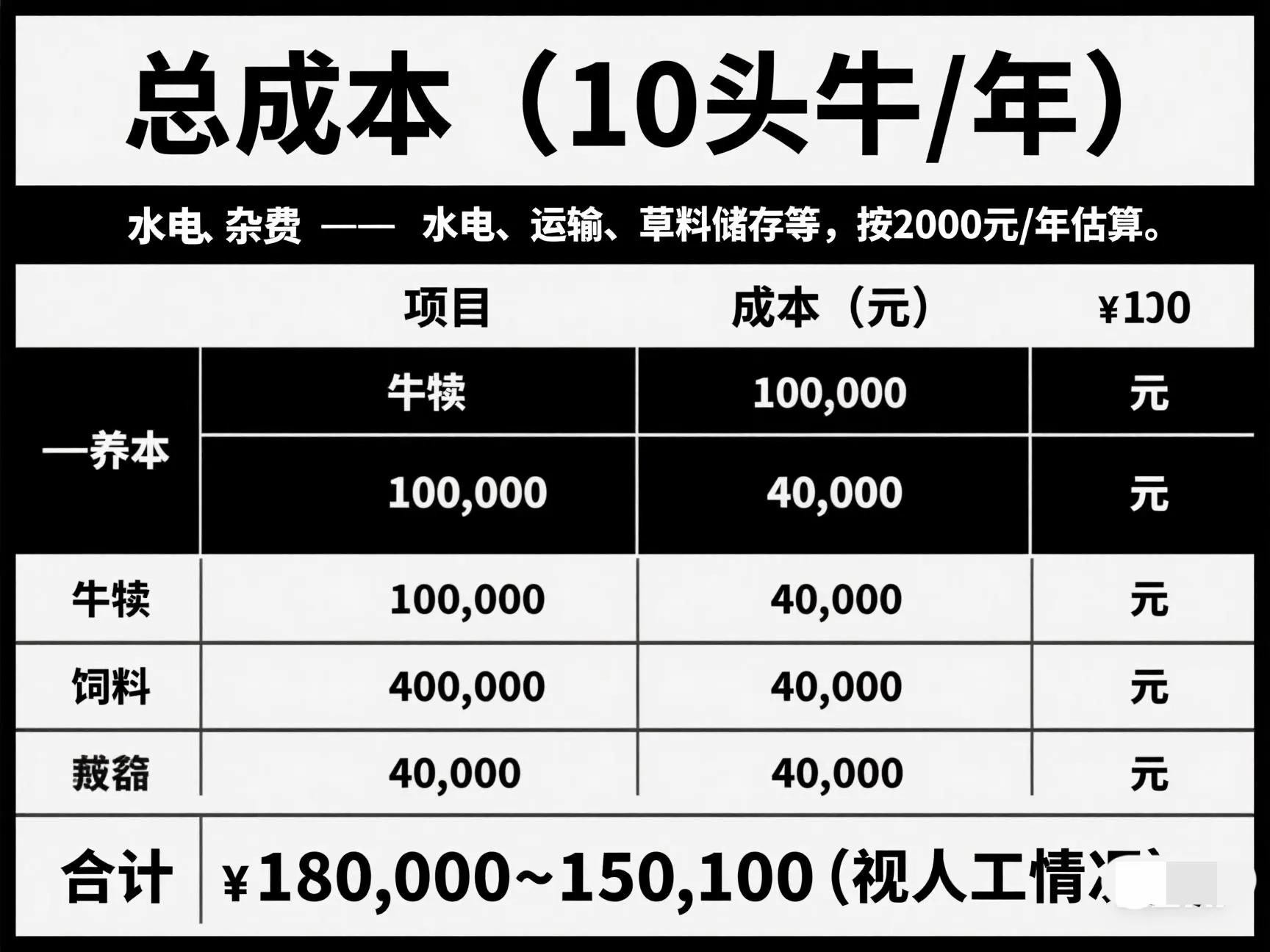 养牛的成本主要包括牛犊购买、饲料、人工、场地、防疫、水电及其他杂费。我们以养殖10头肉牛(育肥模式)为例,计算一年的总成本。